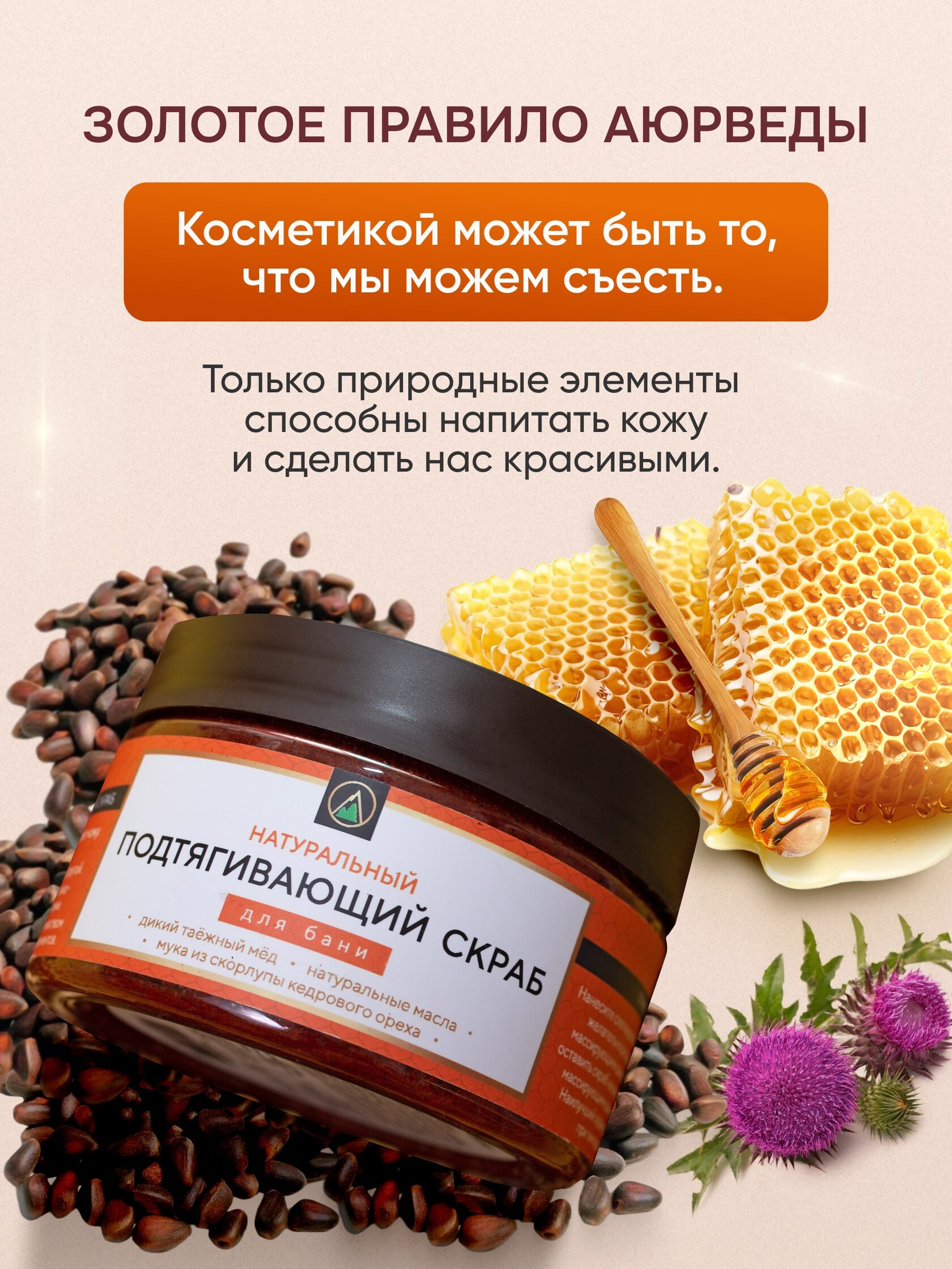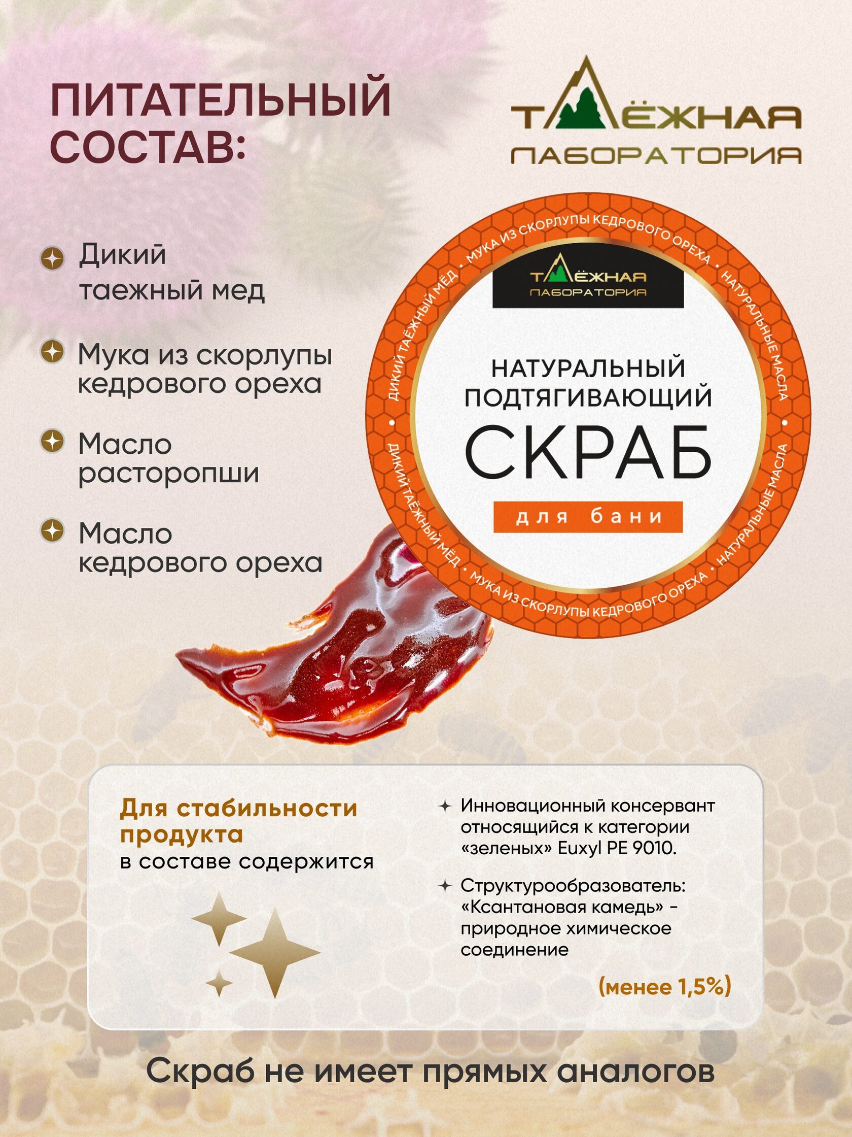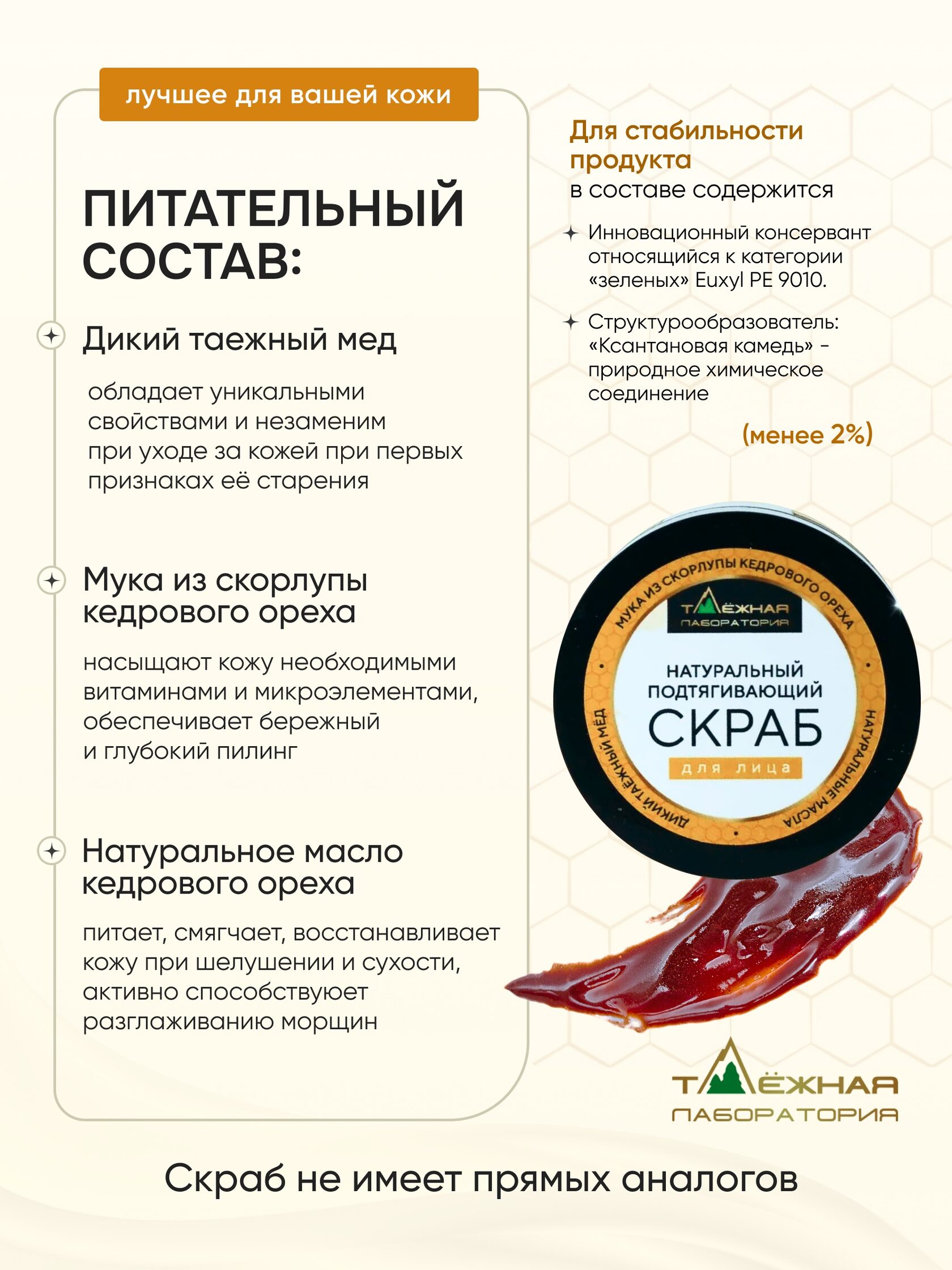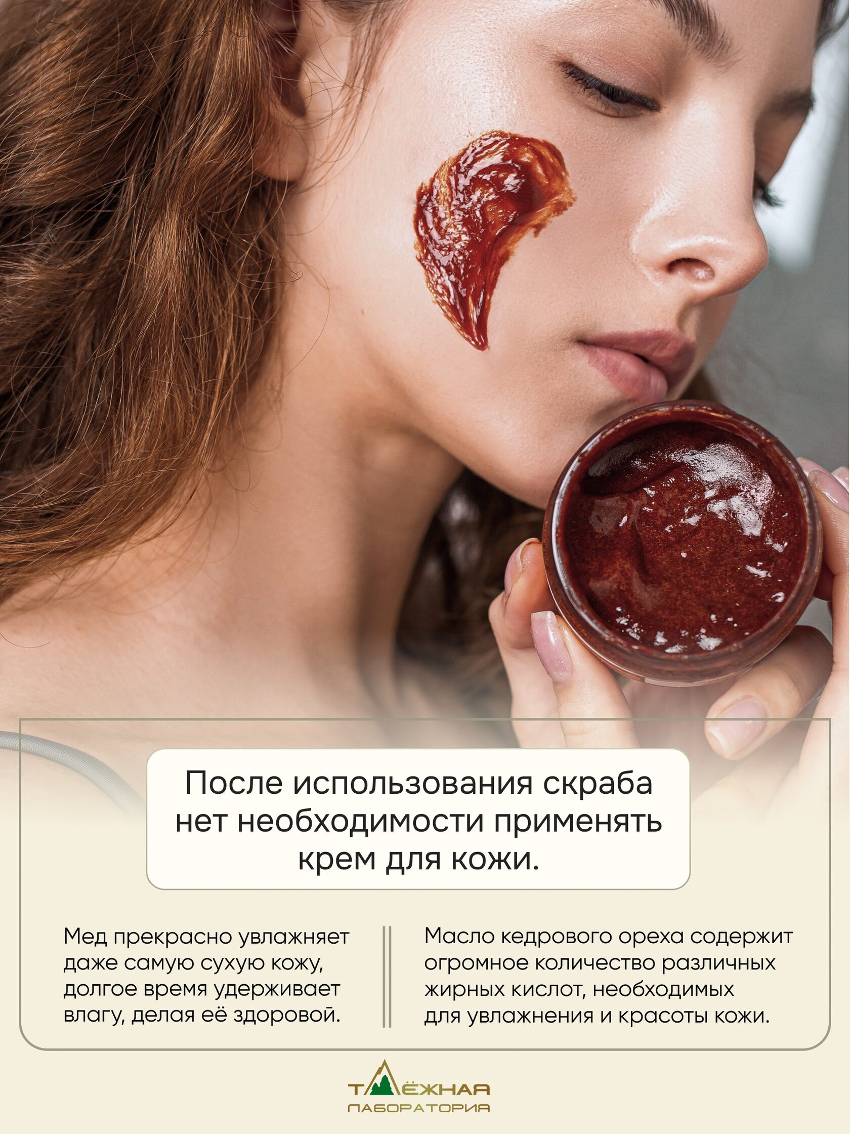 Скраб состоит из двух основных компонентов: меда и скорлупы кедрового ореха и обладает всеми положительными свойствами ингредиентов, из которых он состоит. Также в его состав входят некоторые виды натуральных масел растений произрастающих на Алтае и в Сибирской Тайге.