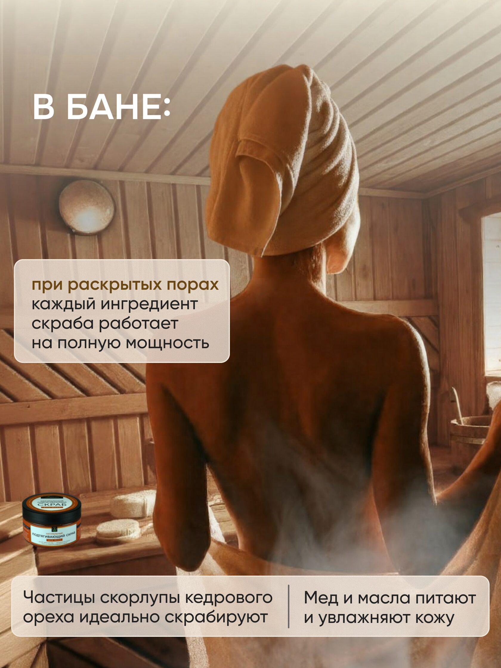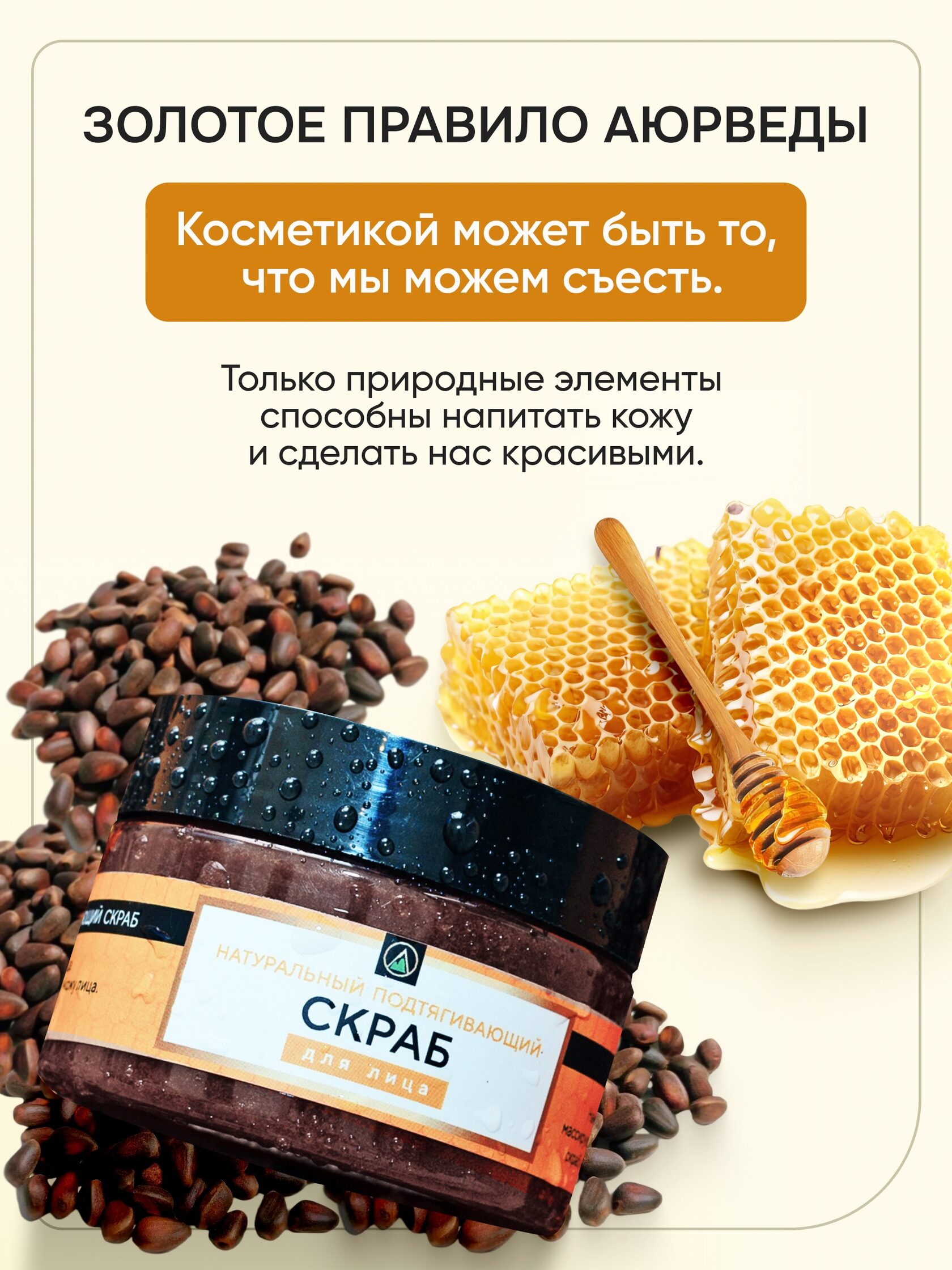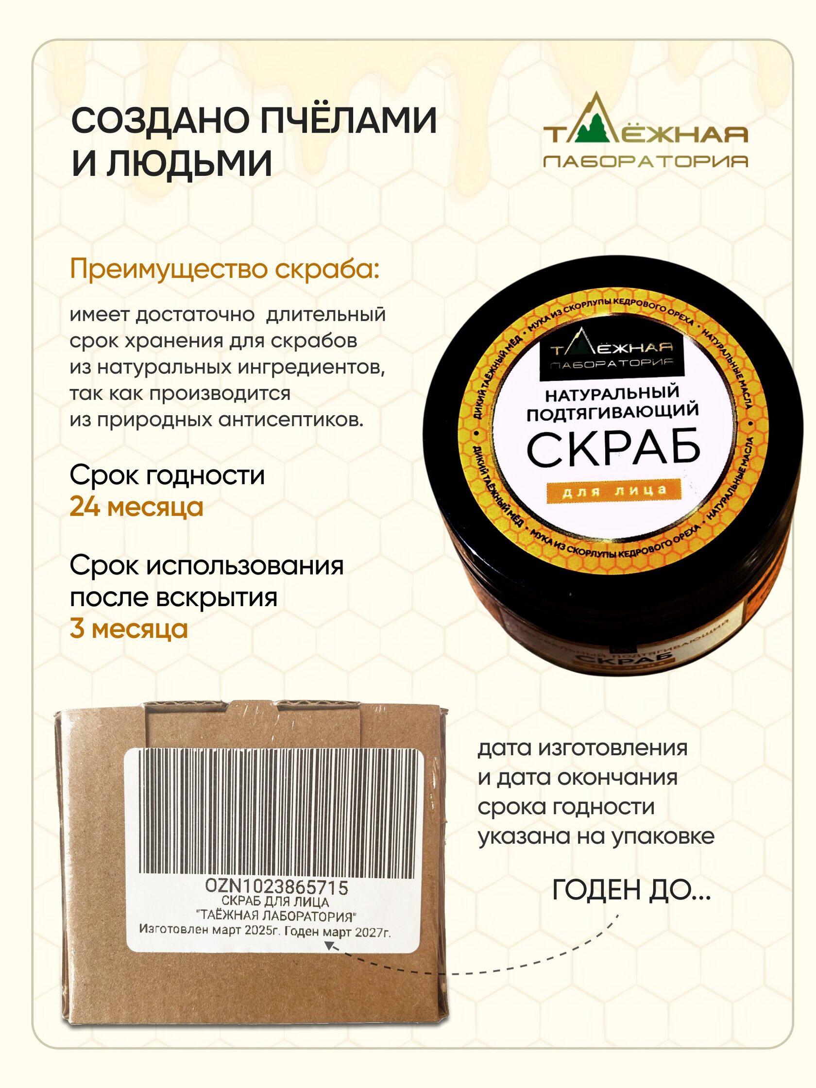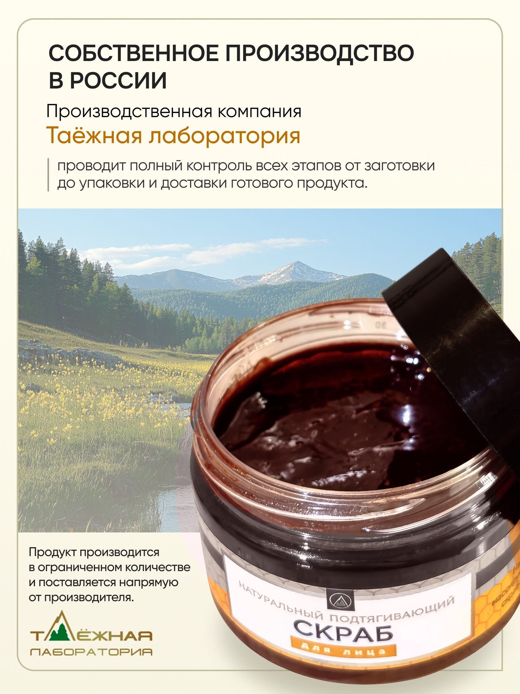 Скраб состоит из двух основных компонентов: меда и скорлупы кедрового ореха и обладает всеми положительными свойствами ингредиентов, из которых он состоит. Также в его состав входят некоторые виды натуральных масел растений произрастающих на Алтае и в Сибирской Тайге.