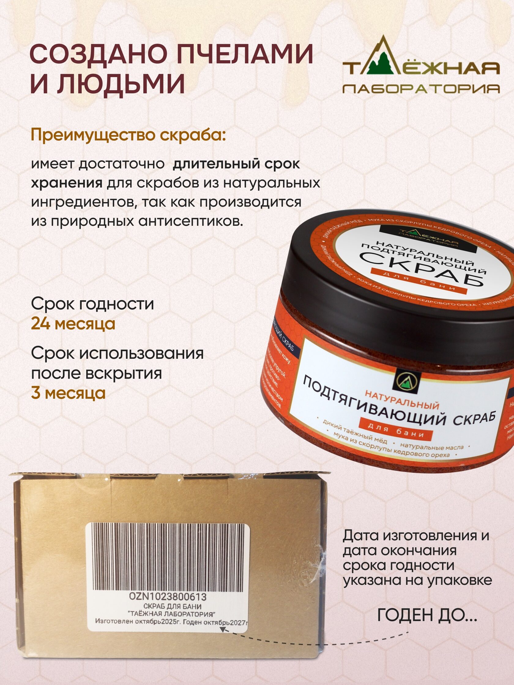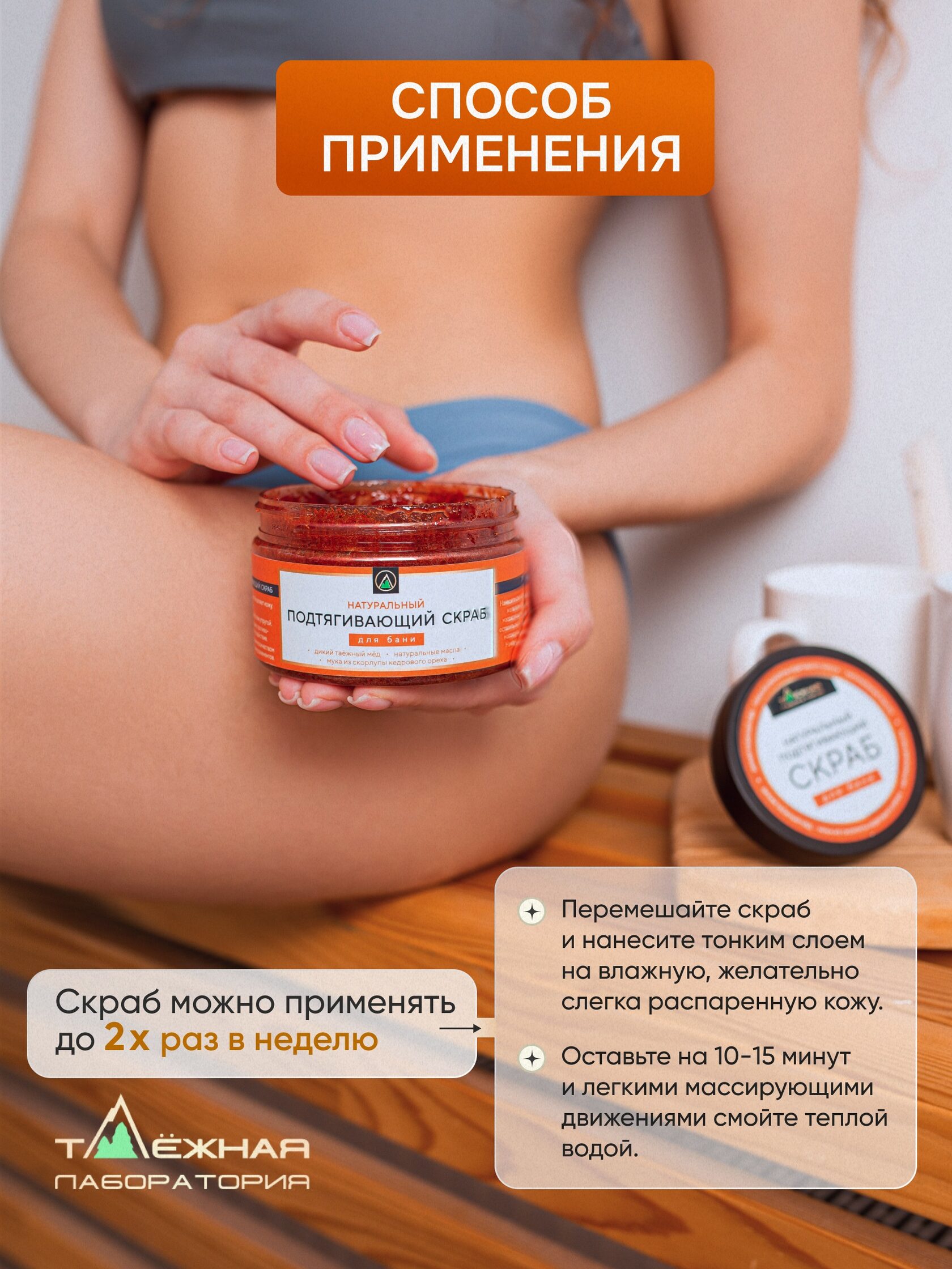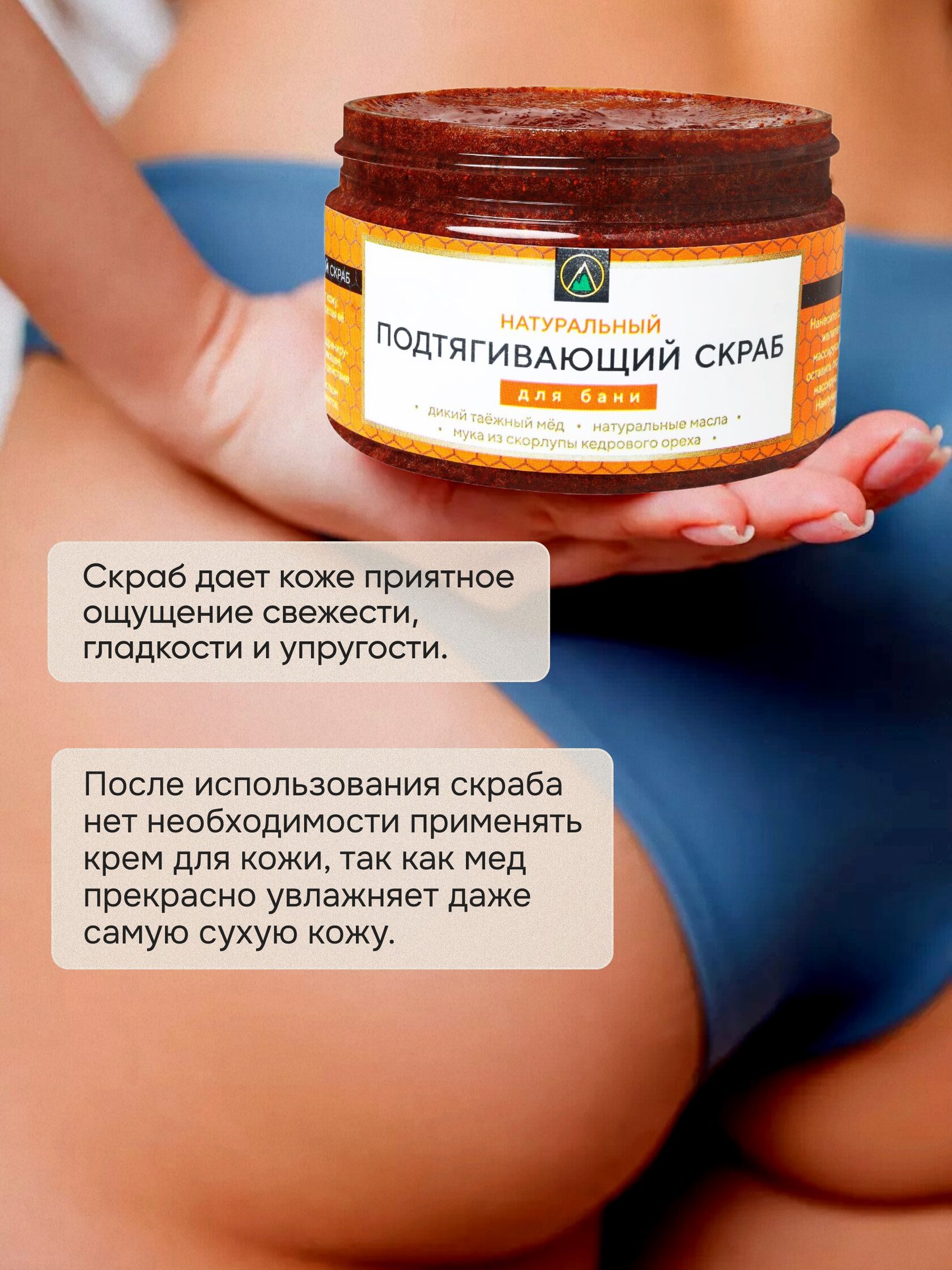 Скраб натуральный подтягивающий от бренда "Таежная Лаборатория" удаляет отмершие клетки, обновляет, тонизирует и питает кожу. Увлажняет кожу и делает ее более упругой. Оказывает антицеллюлитный и лимфодренирующий эффект. Оказывает общеукрепляющее действие на кожу. Обогащает кожу большим количеством необходимых витаминов и микроэлементов.